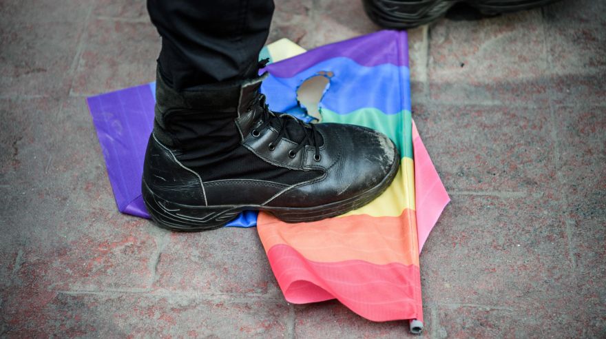 Un policía turco pisa una bandera con los colores del arcoiris perteneciente al colectivo gay en Estambul. / AFP / OZAN KOSE