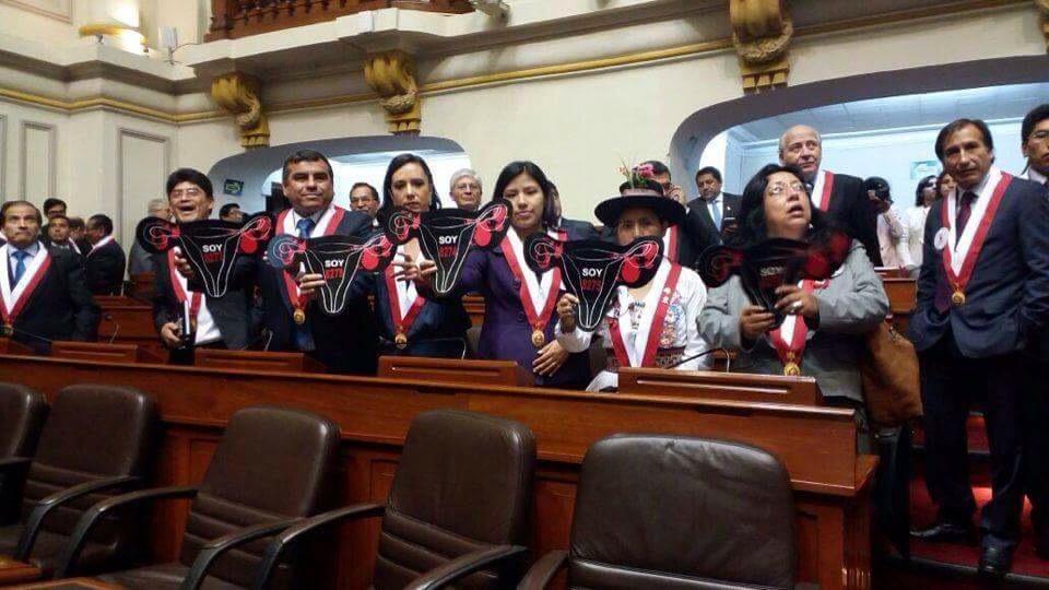Las congresistas Marisa Glave, Indira Huilca Flores,  Tania Pariona y Maria Elena Foronda Farro, fueron algunas de las nuevas legisladoras que alzaron figuras del órgano sexual femenino, manifestando un claro rechazo al pronunciamiento de la Fiscal Marcelita Gutierrez.