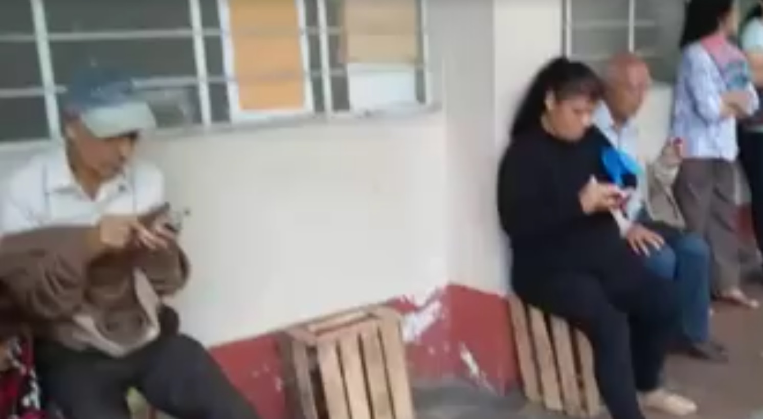 Sobre cajas de frutas de maderas, que no brindan estabilidad, seguridad y comodidad a los pacientes en espera, se sientan por lo menos 7 personas en el consultorio de Nefrología de dicho nosocomio.