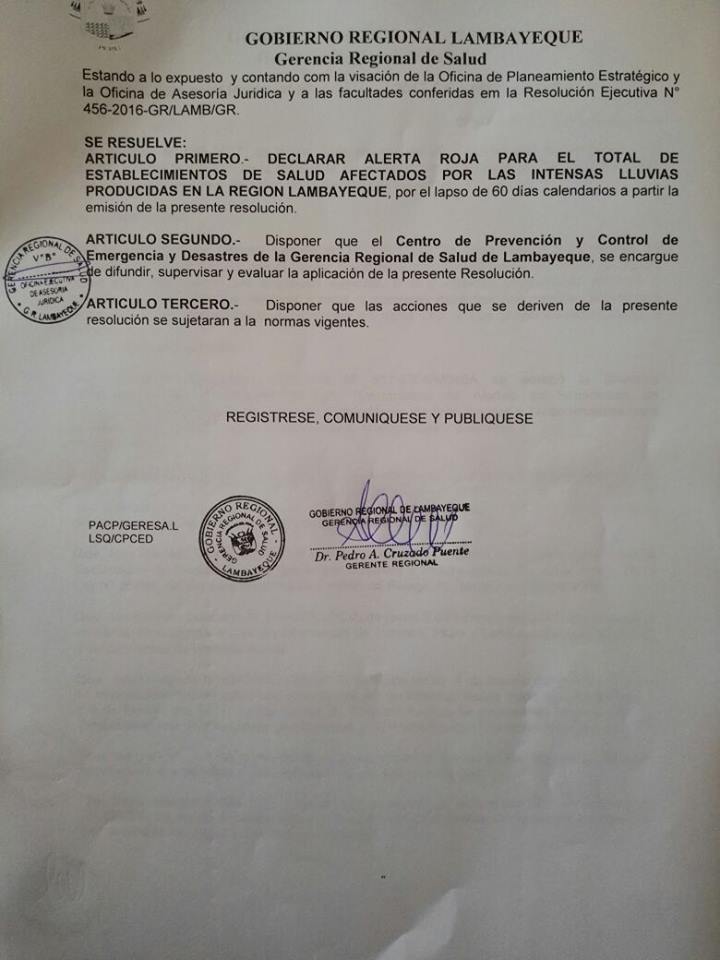 El Gobierno Regional de Lambayeque, declaró todos los establecimientos de la región en alerta roja, pues su infraestructura se encuentra en peligro.