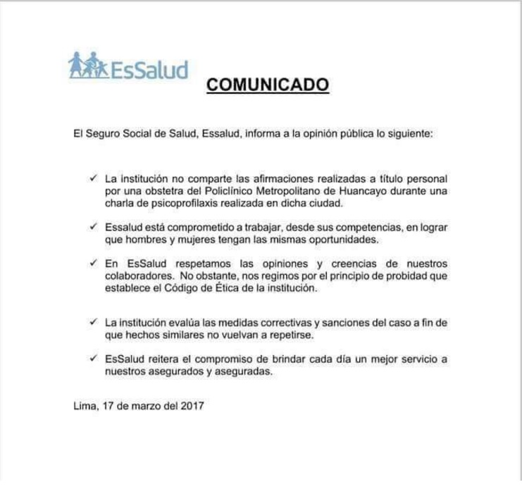 «En EsSalud respetamos las opiniones y creencias de nuestros colaboradores. No obstante, nos regimos por el principio de probidad que establece el Código de Ética… la institución evalúa las medidas correctivas y sanciones del caso a fin de que hechos similares no vuelvan a repetirse», se lee en el comunicado.