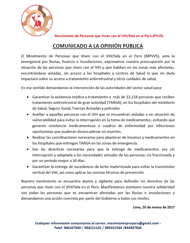 Lima, Perú.- El Tratamiento Antirretroviral de Gran Actividad (TARGA) que consumen la mayoría de personas diagnosticadas con el VIH, ha cambiado el contexto del VIH en el Perú, reduciendo la mortalidad de las personas con el diagnóstico y en la situación de emergencia que vive el país producto de los desbordes de ríos, huaicos y lluvias, podría librarlos de posibles brotes epidémicos.
