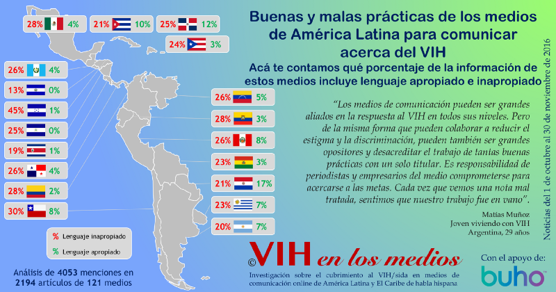 Una investigación realizada con publicaciones recopiladas a finales de 2016 por el colombiano Diego Mora, periodista especializado en Derechos Humanos, arroja que los comunicadores sociales de medios de América Latina incurren en un lenguaje inapropiado al referirse al virus de inmunodeficiencia humana (VIH) y al sida.