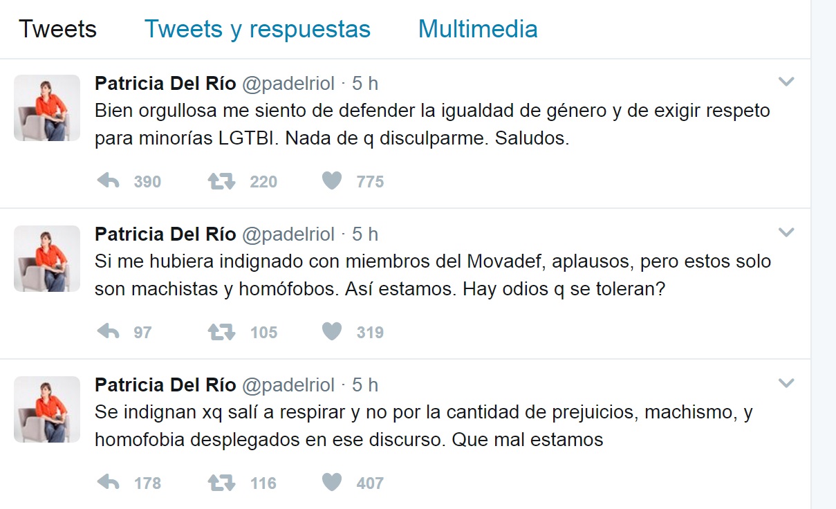La periodista Patricia del Río, intentó explicar con un claro ejemplo de la desigualdad entre hombres y mujeres y dijo en un artículo de opinión y redes sociales que iba a decir basta a este tipo de discursos que discrimina a las personas LGTBI y las mujeres. «Este Discurso Mata», también dijo.