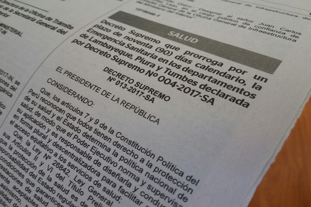 Lima, Perú.- Mediante el Decreto Supremo N° 013-2017-SA, publicado hoy en el diario oficial “El Peruano”, el Poder Ejecutivo prorroga por el plazo de 90 días calendario, contados a partir del 10 de este mes, la Emergencia Sanitaria que fue declarada en las regiones Lambayeque, Piura y Tumbes a través del Decreto Supremo N° 004-2017-SA, publicado también en el “El Peruano” el 8 de febrero pasado.