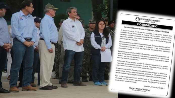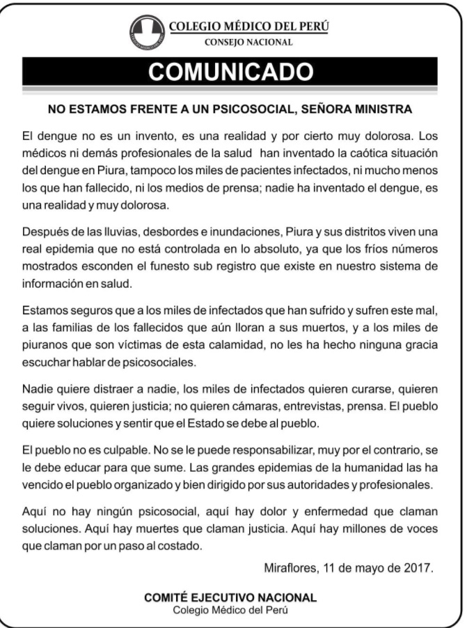El Colegio Médico del Perú le respondió a través de un comunicado, precisando que «no estamos frente a un psicosocial, señora ministra. El dengue no es un invento, es una realidad y por cierto muy dolorosa. Los médicos ni demás profesionales de la salud han inventado la caótica situación del dengue en Piura, tampoco los miles de pacientes infectados, ni mucho menos los que han fallecido, ni los medios de prensa; nadie ha inventado el dengue, es una realidad y muy dolorosa», se lee en el documento colgado en su portal web y difundido en las redes sociales.