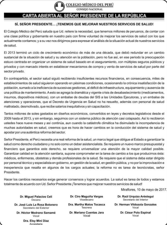 En un pronunciamiento anterior, el CMP ya se había pronunciado para mejorar la salud en el país, con una carta abierta al Presidente de la República, Pedro Pablo Kuczynski, a quién le pedían cambios en la conducción del sistema de salud y apostar por una auténtica reforma del sector. «La improvisación e inexperiencia resalta en los cargos actuales, la reforma no es tarea de tecnócratas, señor presidente» decía el párrafo final del comunicado, en clara alusión a la actual ministra y al pedido de ser separada del cargo.