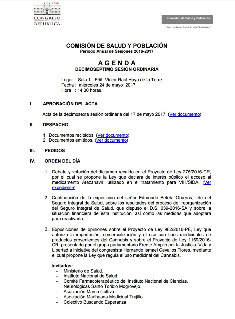 Lima, Perú.- A partir de las 2:30 de la tarde de hoy, la Comisión de Salud y Población del Congreso de la República agendó el debate y votación del dictamen recaído en el Proyecto de Ley 275/2016-CR, por el cual se propone la Ley que declara de interés público el acceso al medicamento Atazanavir, utilizado en el tratamiento para VIH/Sida que se encuentra en situación de monopolio, debido a un derecho de propiedad intelectual otorgado por Indecopi a la compañía Bristol Mayers Squibb (BMS).