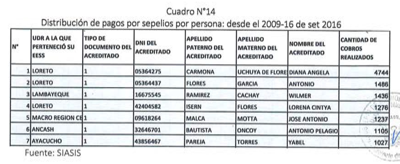 Sin embargo, ahí no acaban las irregularidades con las tercerizaciones. En relación con la compra de prestaciones de sepelios, se ha identificado personas que han registrado cobros por este concepto más de una vez. Algunos incluso representantes de funerarias o personas vinculados a ellas. El documento que sustenta los pagos, es que fueron afiliados al SIS en la modalidad de pobres y pobres extremos. El gasto por este concepto se ha duplicado entre el 2004 y el 2016.
