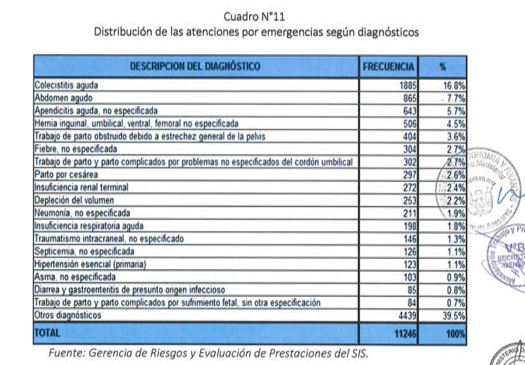 Entre los cinco diagnósticos más usuales atendidos en emergencia en las entidades privadas son: Colecistitis aguda (17%); situaciones de partos (9.6%); abdomen agudo (8%); apendicitis (6%) y hernia inguinal (5%). Se agrega que los cinco procedimientos médicos tercerizados entre un hospital público al privado, se encuentran: Tomografías, resonancias magnéticas, hemodiálisis, cateterismo cardíaco y embolización que se llevan gran presupuesto del SIS con cifras que van desde los 2 hasta los 27 millones de soles.