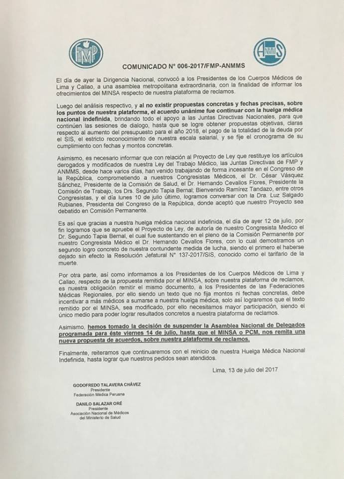 Lima, Perú.- Aunque parecía que el diálogo sostenido con el Ministra de Salud (Minsa, Patricia García y luego con el Premier Fernando Zavala, terminarían con la huelga médica, la Federación Médica Peruana (FMP) informó que al no tener propuestas concretas y fechas precisas en los puntos solicitados para mejorar el sistema de Salud, el gremio médico continuará con su medida de fuerza.