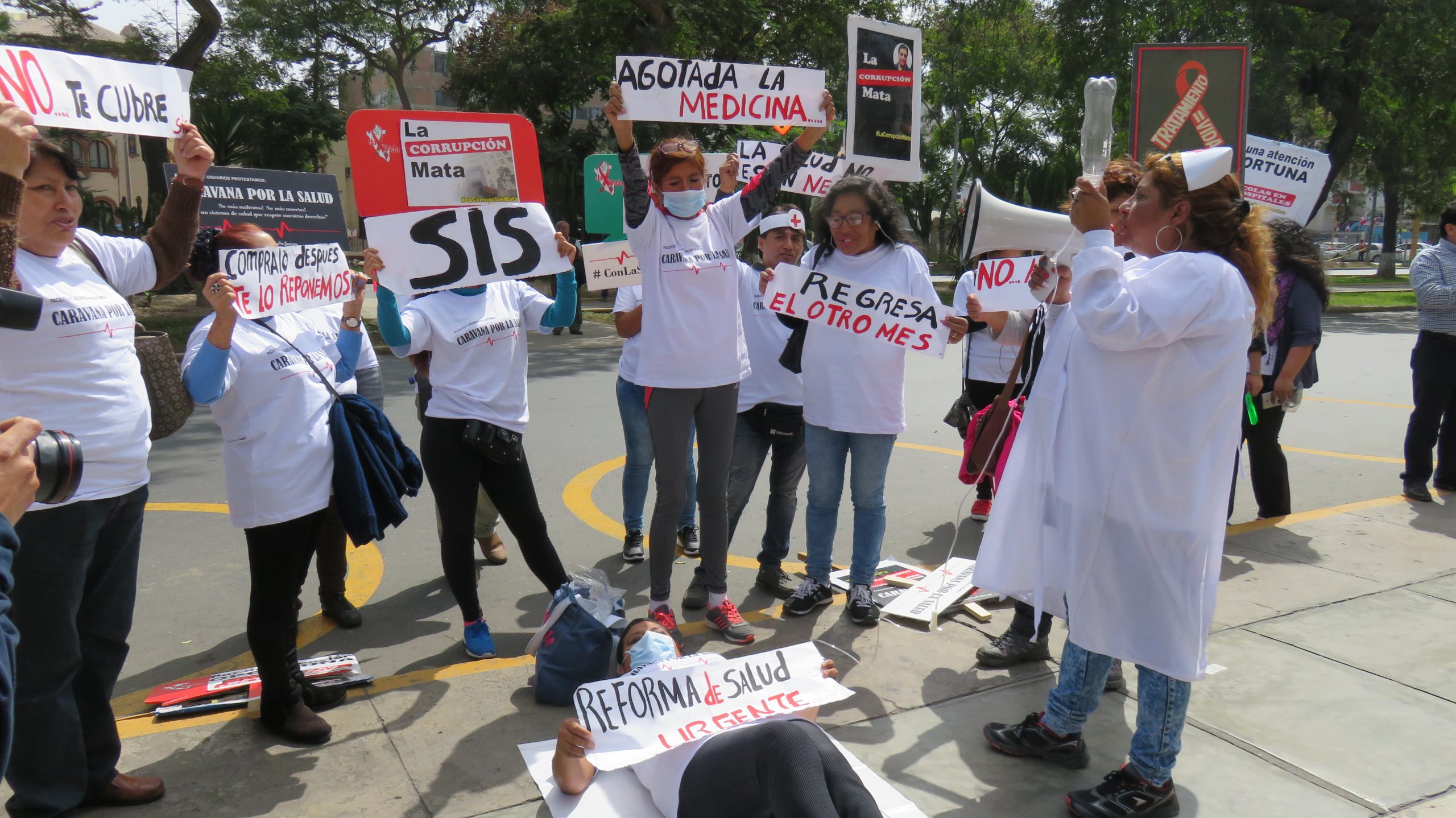Lima, Perú.- Pacientes de diversas enfermedades, agrupados en la Red Peruana de Pacientes y Usuarios en Salud, realizaron un plantón en los frontis del Ministerio de Salud, el Centro Nacional de Abastecimiento de Recursos Estratégicos en Salud (Cenares) y la Asociación Nacional de Laboratorios Farmacéuticos (Alafarpe), para exigir una reforma integral del sistema sanitario en el Perú.