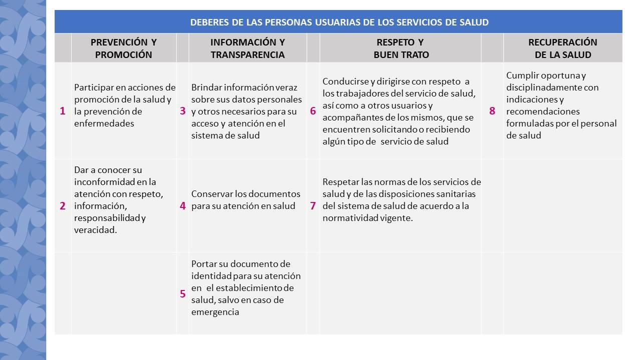 La Superintendencia Nacional de Salud (Susalud), viene impulsando la promoción de ocho deberes que el paciente o usuario debe cumplir durante las prestaciones de salud, que lejos de garantizar un adecuado servicio dentro del sistema, pretendería deslindar responsabilidades individuales e institucionales frente a mala atención y negligencias médicas.