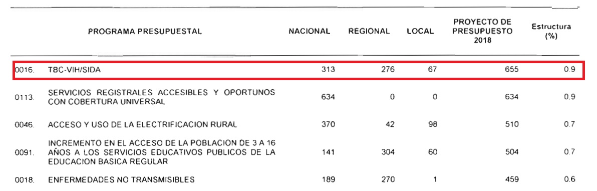 El Proyecto de Presupuesto General de La República ha contemplado unir el programa de VIH junto con el de tuberculosis, donde se le asignará un total de 655 millones de soles para el control, prevención y tratamiento de ambas condiciones de salud.