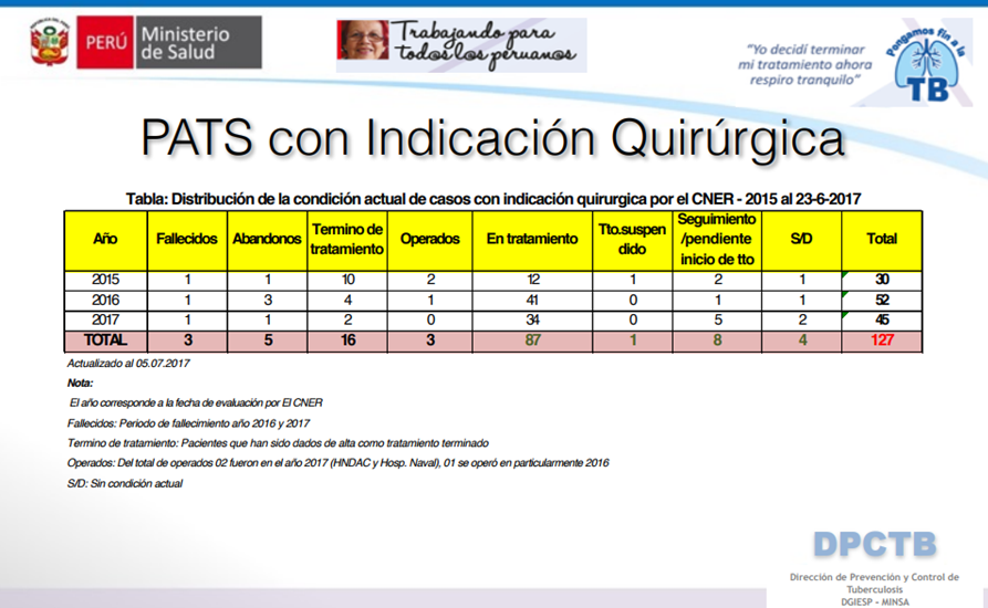 La cifra de muertes y casos en lista de espera para las operaciones fueron presentados el pasado 12 de julio, por las mismas autoridades del sector salud, durante una reunión para evaluar la situación de esta problemática, que da cuenta que una persona con tuberculosis logró operarse de manera particular y otras dos lograron hacerlo en el Hospital Nacional Daniel Alcides Carrión del Callao.
