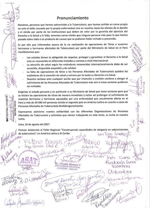 La Red de Personas Afectadas de Tuberculosis de Las Américas y el Caribe enviaron un pronunciamiento a las autoridades peruanas sobre la no realización de operaciones de tórax a personas afectadas de tuberculosis en el Perú.