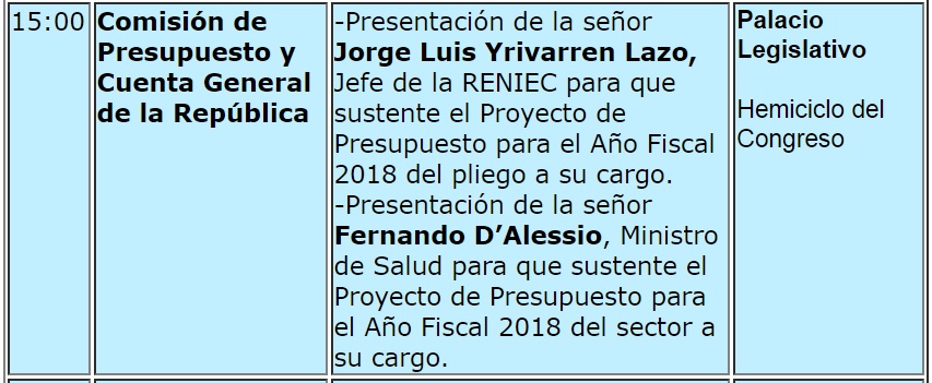 Cabe indicar que la comisión de Presupuesto del Congreso de la República recibirá por la mañana a los titulares de Cultura, Mujer y Poblaciones Vulnerables y Justicia para revisar el presupuesto asignado a cada sector. Por la tarde hará lo propio con el Jefe del Reniec y Salud.