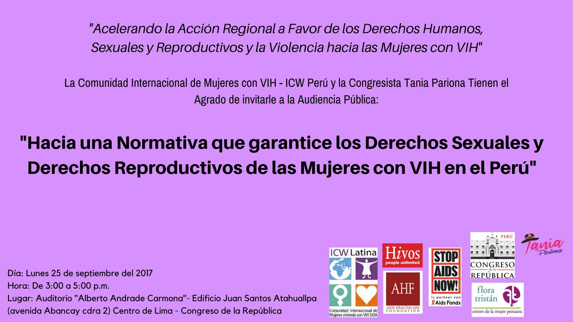 Con el respaldo de la congresista del grupo parlamentario Frente Amplio Tania Parion; la Comunidad Internacional de Mujeres que Viven con el VIH (ICW – Perú) realiza mañana la audiencia pública denominada: “Hacia una normativa que garantice los derechos sexuales y derechos reproductivos de las mujeres con VIH”.