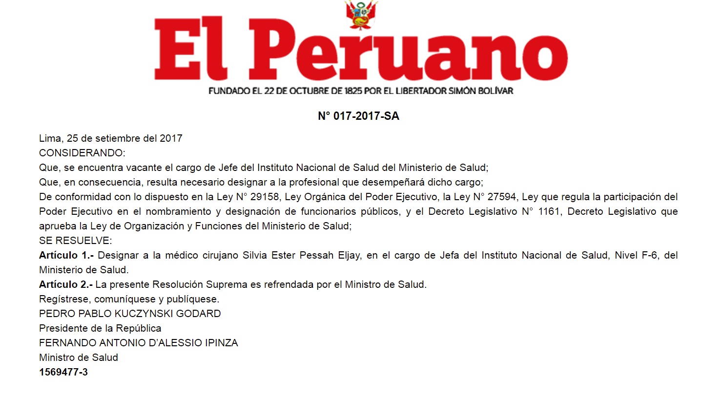 Lima, Perú.- La médico cirujano Silvia Ester Pessah Eljay, ex ministra de Salud Pública durante la gestión de Patricia García Funegra, fue designada en el cargo de Jefa del Instituto Nacional de Salud (INS), del Ministerio de Salud, según Resolución Suprema N° 017-2017-SA publicada hoy en el diario oficial El Peruano.