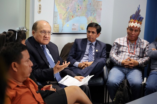 Lima, Perú.- El ministro de Salud, Fernando D’Alessio recibió en su despacho a los Apus de las cuencas de los ríos Chambira, Pastaza, Marañón, Tigre y Corrientes de la región Loreto, con el objetivo de dialogar sobre las alternativas de solución a los problemas de salud de las cinco cuencas que agrupa a más de 90 000 pobladores. “Vamos a coordinar con la Dirección Regional de Salud (Diresa) porque es necesario que los servicios lleguen no importa cuán lejos o cerca estén los pobladores, estos deben ser los mismos”, indicó el titular a los representantes de las comunidades amazónicas.