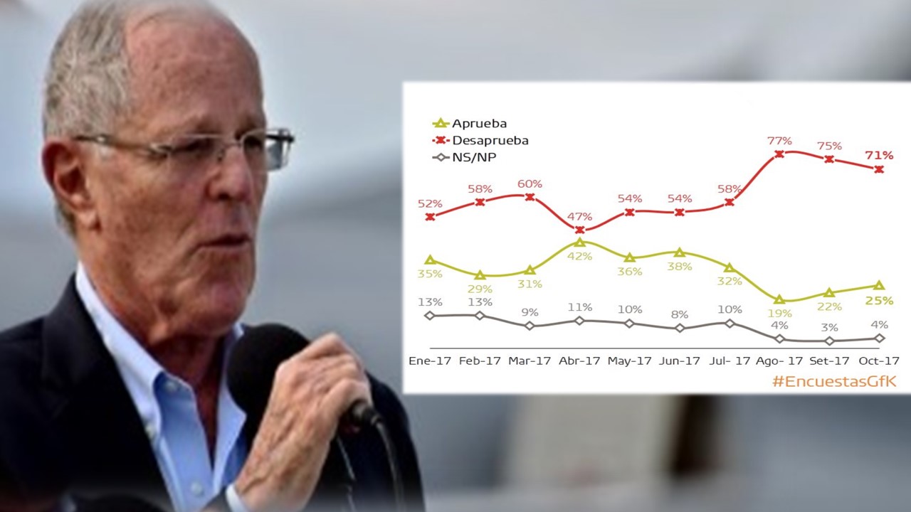 Lima, Perú.- La popularidad del presidente Pedro Pablo Kuczynski subió tres puntos y alcanzó un 25 % en octubre, según la última encuesta nacional urbano rural de GfK.