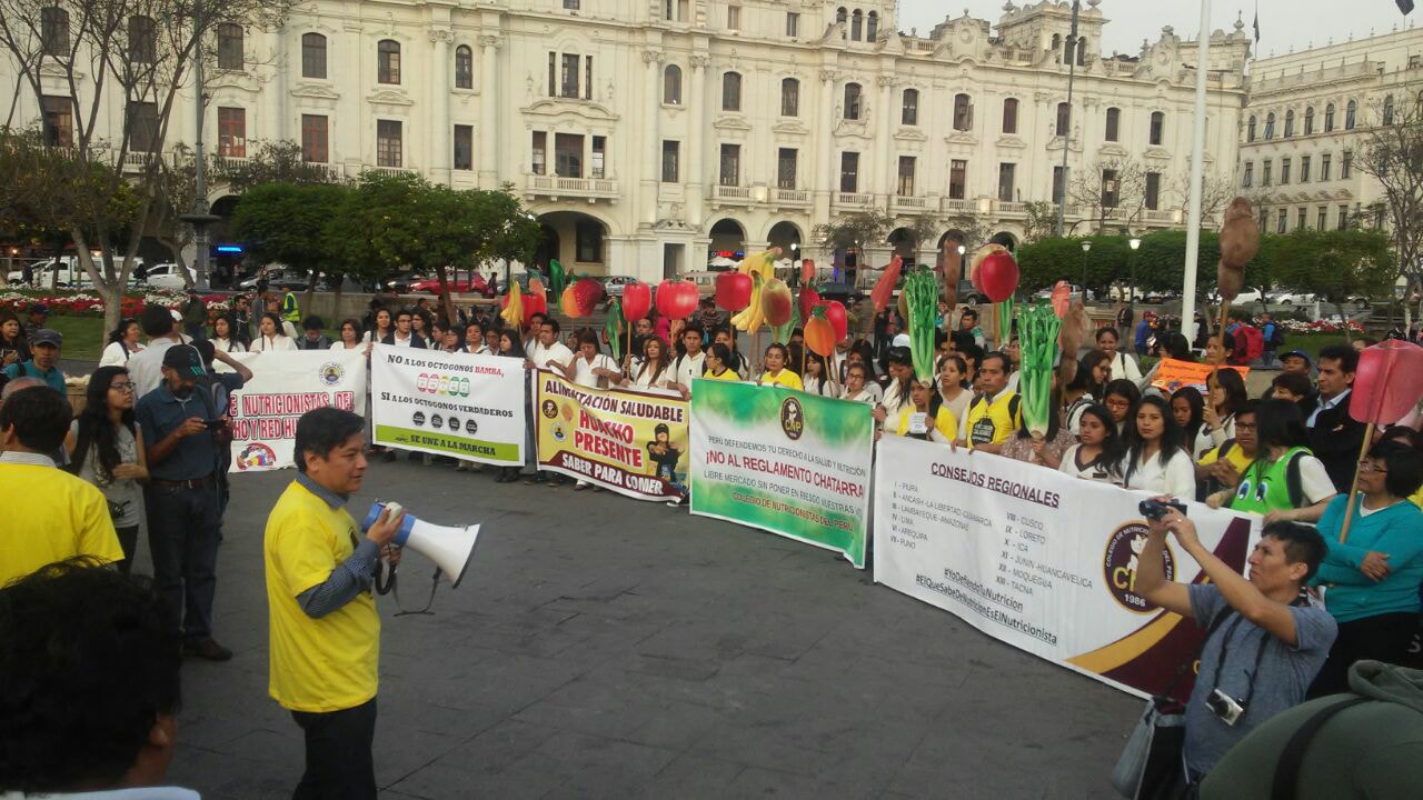 Con pancartas en mano, los manifestantes, pidieron al Congreso de la República, aprobar leyes que favorezcan la salud de los peruanos y peruanas y no privilegiar a la industria alimentaria, que según los marchantes, vienen haciendo un fuerte lobby en el congreso de la República.