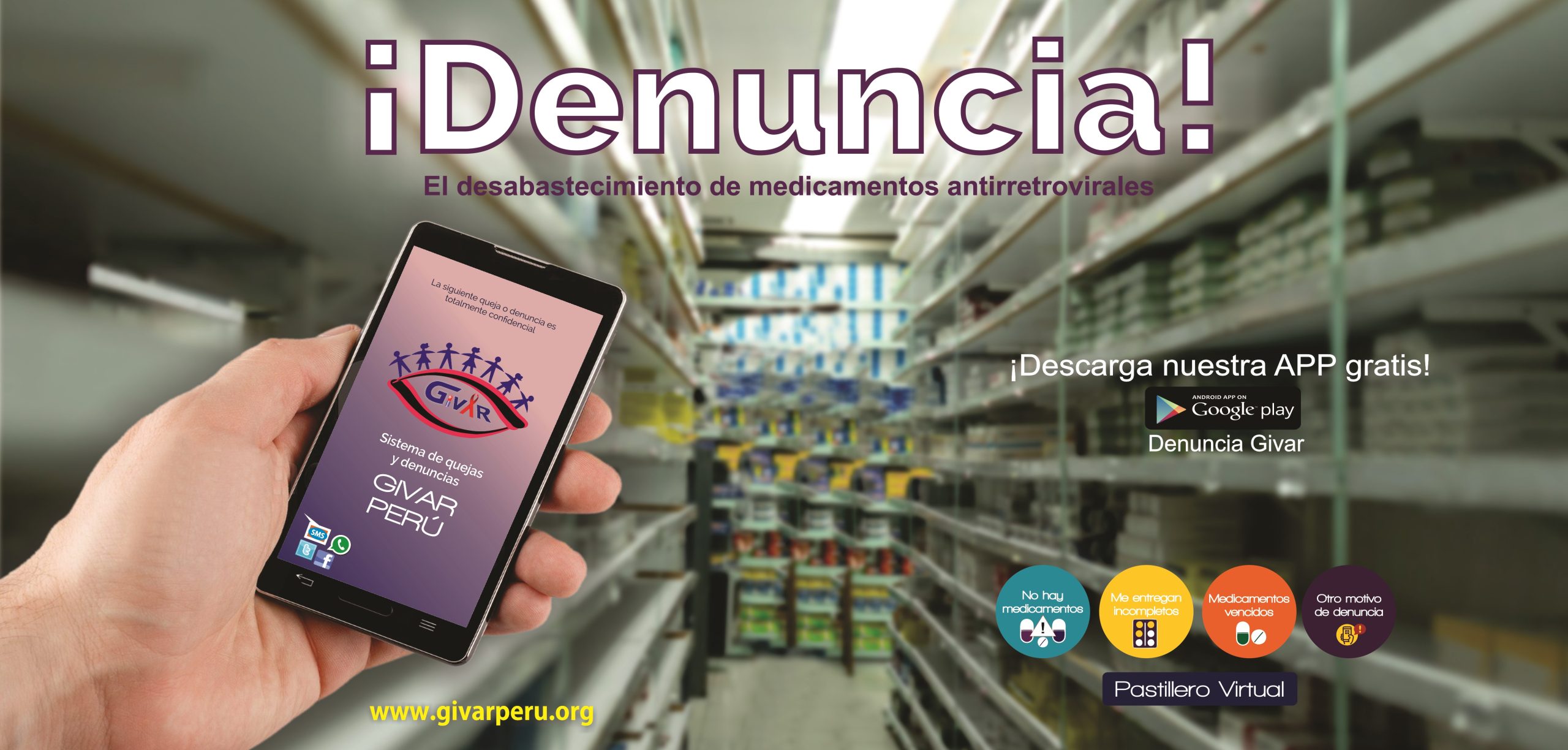Lima, Perú.- Las personas que viven con el VIH y sida en el Perú, podrán denunciar la falta de medicamentos antirretrovirales, descargando gratis a su teléfono móvil la aplicación (APP) “Denuncia Givar”, para vigilar el acceso oportuno de los medicamentos que entrega el Ministerio de Salud, Essalud y las sanidades de las Fuerzas Armadas y Policía Nacional.