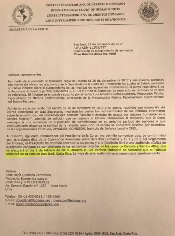 La audiencia se realizará el 2 de febrero en Costa Rica, sede de la corte, a la que deberán acudir  abogados de las víctimas de ambas matanzas y representantes del Estado Peruano para informar sobre el indulto otorgado a Fujimori en 13 días.