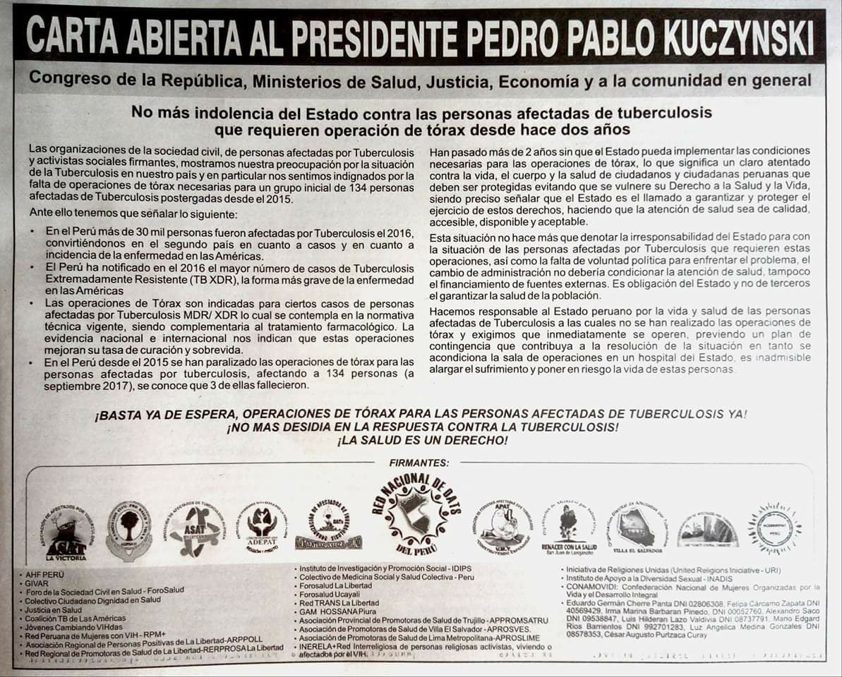 Lima, Perú.- Fuerte y contundente mensaje. Mediante una carta abierta publicada esta mañana en el diario La República, las organizaciones de la sociedad civil, de personas afectadas por Tuberculosis y activistas por los derechos en salud, responsabilizaron al Estado peruano por la vida y salud de las personas afectadas de tuberculosis, a las cuales no se han realizado las operaciones de tórax desde el 2015 y exigieron que inmediatamente se inicien las intervenciones.