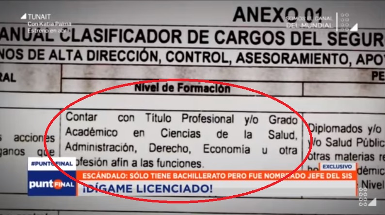 Lima, Perú.-   Una grave denuncia ha salido a la luz luego de que se afirmara que el nuevo jefe del Seguro Integral de Salud (SIS) cuenta con el grado académico de bachiller, mas no con título profesional como lo requería el «Manual Clasificador de Cargos del SIS» de dicha entidad.