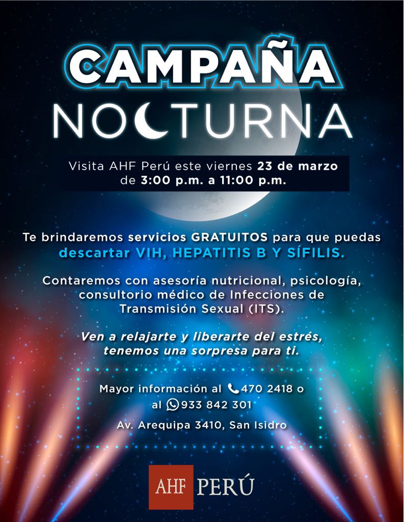 Lima, Perú.- Con la finalidad de brindar atención, diagnóstico y consejería oportuna sobre ITS, VIH y Sida, la organización AHF PERU realizará este viernes 23 de marzo de 3:00 a 11:00 pm una campaña de atención nocturna para todos aquellos que por trabajo o estudios no pueden acudir en un horario regular a un servicio de salud.