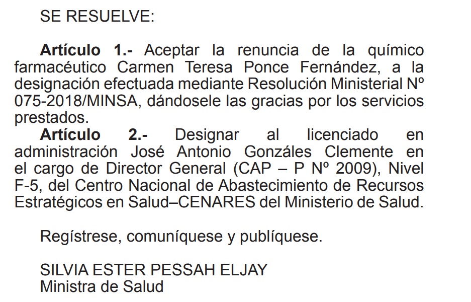 Lima, Perú.- La ministra de Salud, Silvia Pessah Eljay, designó al licenciado en Administración José Antonio Gonzales Clemente como nuevo Director General del Centro Nacional de Abastecimiento de Recursos Estratégicos en Salud (CENARES), mediante R.M N298-2018. Gonzales Clemente, es el cuarto director que asume el cargo, en menos de dos años.
