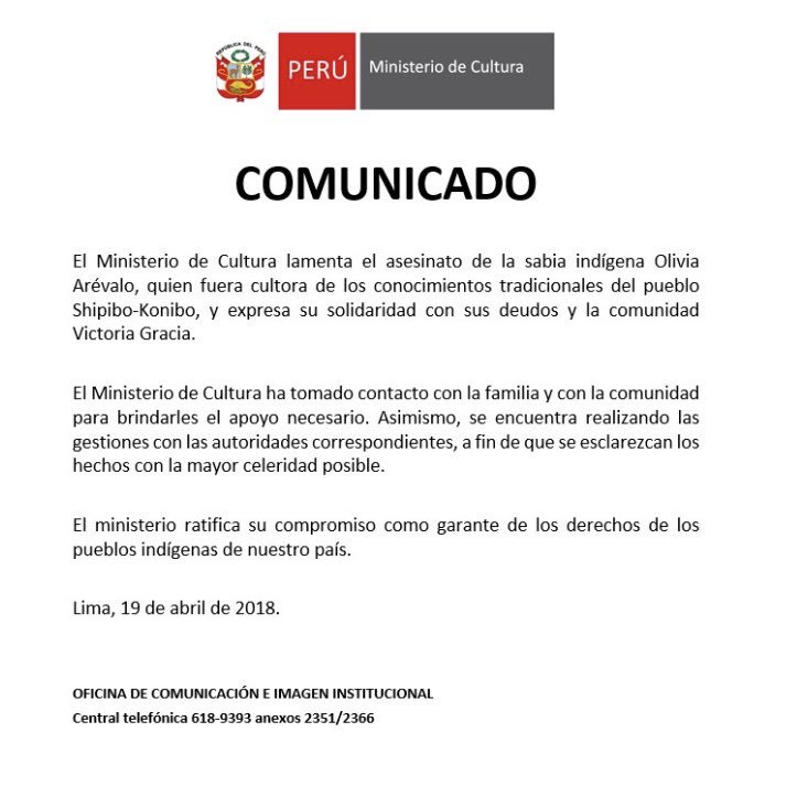 Mediante un comunicado publicado en redes sociales, el Ministerio de Cultura lamentó el asesinato de la sabia indígena y manifestó que realizan las gestiones con las autoridades pertienentes a fin que se esclarezcan los hechos a la brevedad posible.