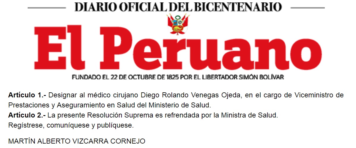 Lima, Perú.- El presidente de la República Martín Vizcarra y la ministra de Salud, Silvia Pessah, designaron al médico cirujano Diego Rolando Venegas Ojeda, en el cargo de Viceministro de Prestaciones y Aseguramiento en Salud del Ministerio de Salud, mediante Resolución Suprema 015-2018 SA