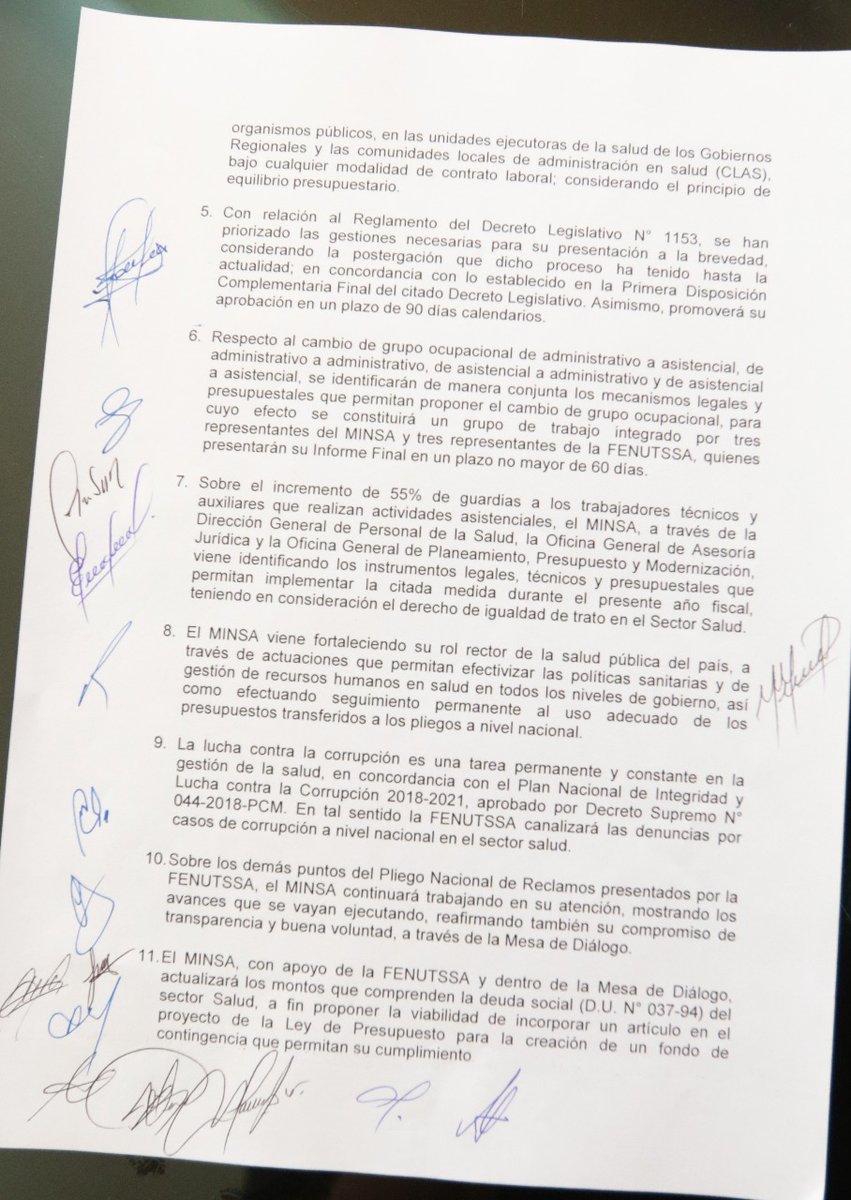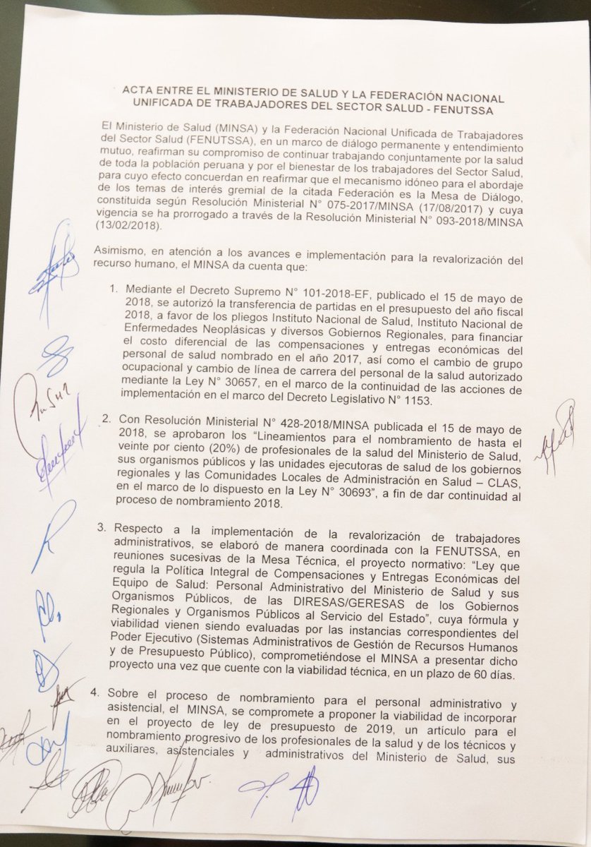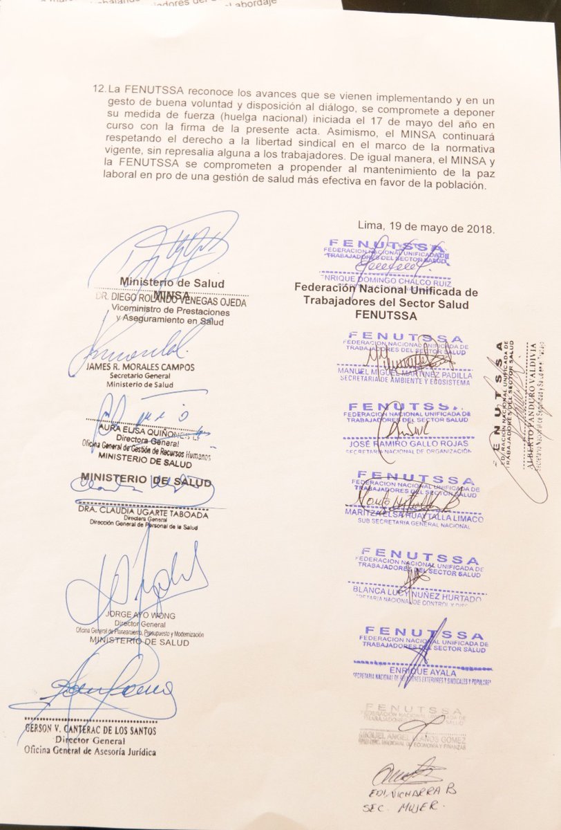 Lima, Perú.- El Ministerio de Salud (Minsa) y la Federación Nacional Unificada de Trabajadores del Sector Salud (Fenutssa) acordaron el levantamiento de la huelga nacional indefinida, que se inició el pasado jueves 17 de mayo, mediante la suscripción de un acta de 12 puntos.