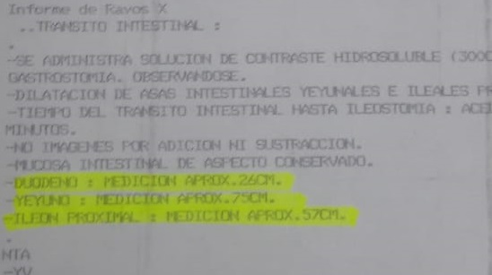«El año pasado, Max tenía vómitos y el doctor me dijo que tenía inflamado los intestinos, pero mi hijo entró por emergencia y en UCI (Unidad de Cuidados Intensivos), hasta que cuando estaban sus intestinos a punto de explotar tuvieron que operarlo, porque el médico Víctor Casquero Montes (Cirujano pediátrico) no quería que lo operaran y puso trabas (…) Max tuvo 6 operaciones y de todo su intestino de casi 7 metros ahora tiene 57 cm (…) Ahora lo están condenando a la muerte, sino fuera porque le han hecho un tránsito intestinal – estudio por imágenes de los intestinos- nadie sabía que le habían cortado su intestino» dijo.