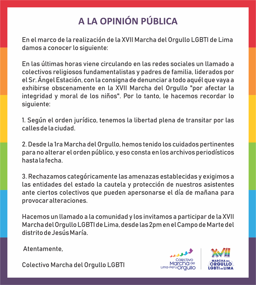 Ante esta amenaza pública, el Colectivo Marcha del Orgullo LGTBI pidió a las autoridades del Estado resguardar el recorrido de la actividad, para evitar cualquier situación que afecte la integridad de los manifestantes. Así mismo en un comunicado publicado por los organizadores de la marcha dijo que existe la libertad de tránsito, precisando que en todas las marchas desarrolladas, se ha tenido un estricto cumplimiento al orden público.