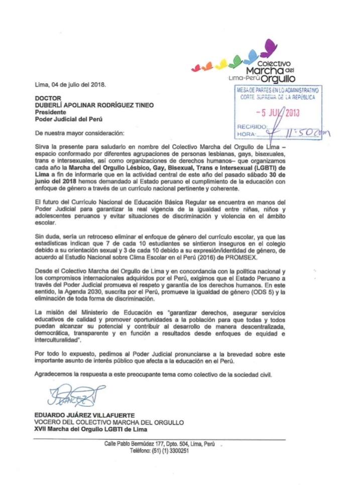 Mediante un comunicado, dirigido al presidente del Poder Judicial Duberlí Rodríguez, el colectivo LGBTI advierte que, de no tomar en cuenta su solicitud, se cometería un retroceso en la promoción del respeto y garantía de los derechos humanos. “La Agenda 2030, suscrita por el Perú, promueve la igualdad de género, de acuerdo al Estudio Nacional sobre el Clima Escolar en el Perú (2016) de Promsex”, indica el documento emitido.