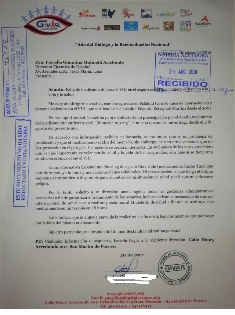 Para Andrés, la entrega de este medicamento, así como lo s otros tres de su terapia, son de vida o muerte, por lo que no le quedó otra alternativa que enviar una carta notarial a EsSalud y quizás en adelante demandar a dicha institución contra la vida el cuerpo y la salud de la mano con el colectivo GIVAR, que vigila el abastecimiento oportuno en la entrega de medicamentos para el VIH.
