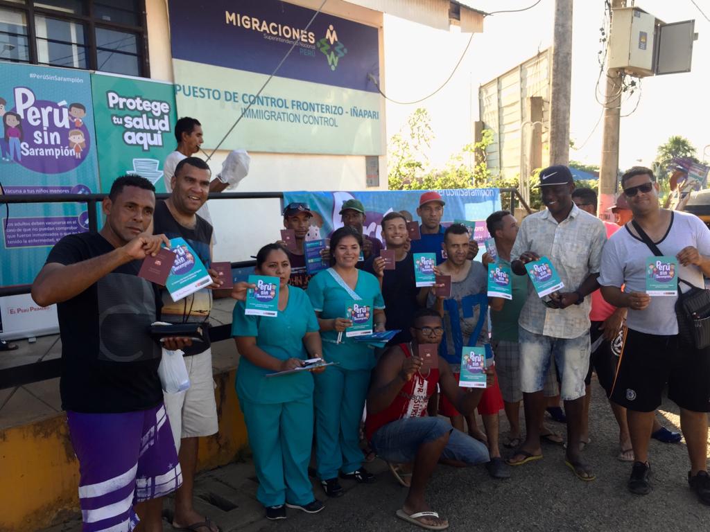 En Madre de Dios, las brigadas de vacunación del Minsa llegaron al local de migraciones, en Iñapari, para reforzar la campaña de vacunación contra el sarampión. Los migrantes, además, recibieron información sobre los síntomas de enfermedades como la rubéola y la influenza. En este lugar se observó el paso de venezolanos, peruanos, bolivianos y otros extranjeros a Brasil y viceversa.