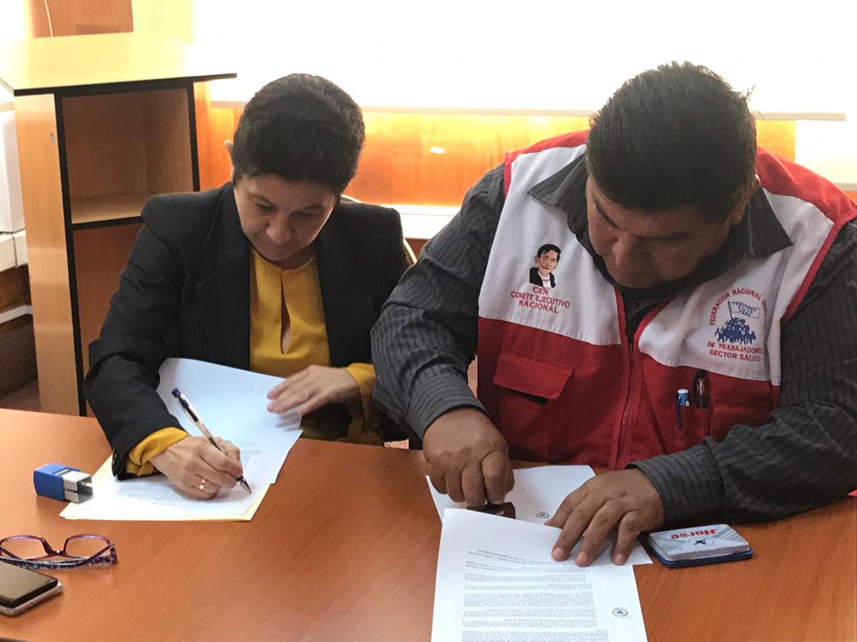 ►Viceministra Claudia Ugarte y sec. gral. de Fenutssa, Enrique Chalco, suscriben el documento. #TrabajamosConElCorazón pic.twitter.com/Wnrw08qVdk