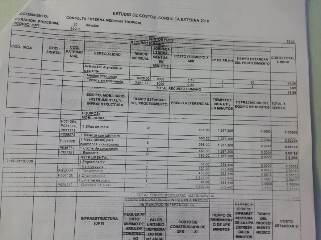 Cuadro del Estudio de Costos Consulta Externa 2018 elaborado en el hospital Cayetano Heredia