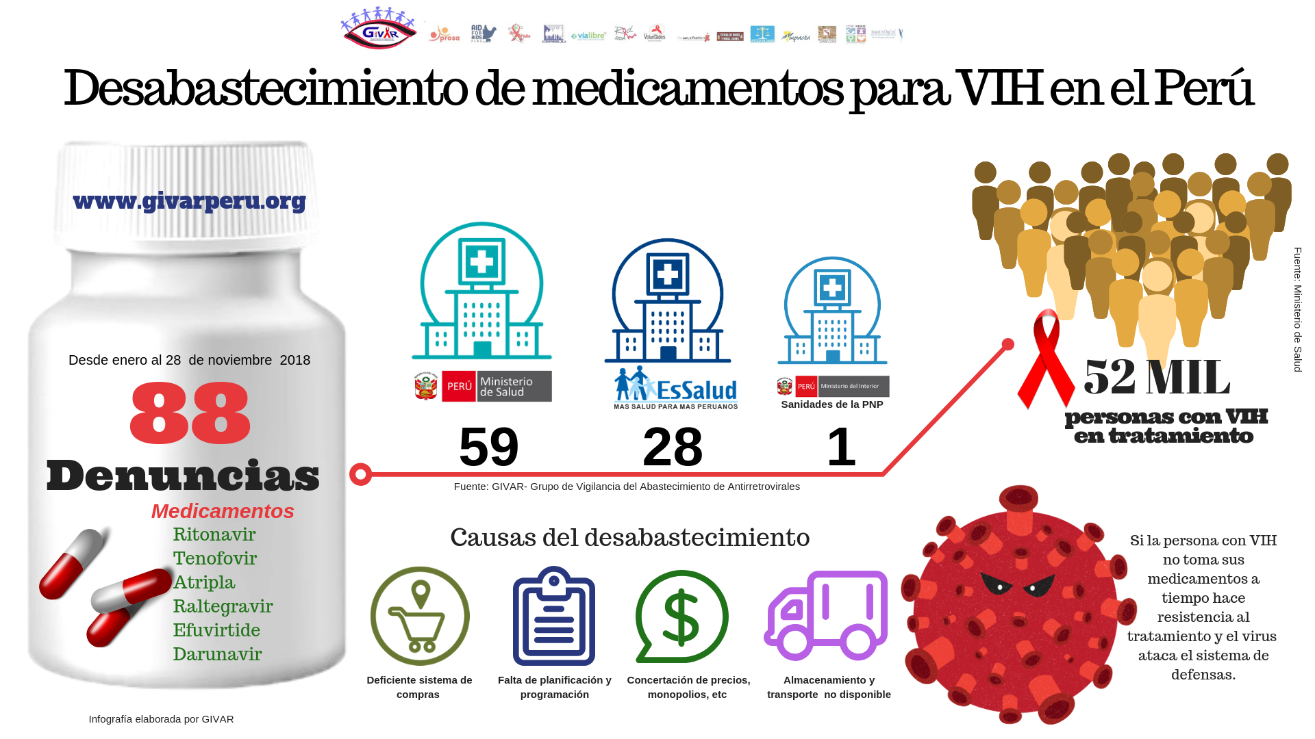 Dato: Cabe indicar que GIVAR está conformado por 15 organizaciones de la sociedad civil, entre ellas Sí, da Vida; Prosa, Cepesju, Via Libre, Impacta, Red Sida Perú, Comunidad Internacional de Mujeres con VIH, Acción Internacional para la Salud, Aid For Aids, Movimiento de Personas que viven con el VIH, Voluntades Lima Norte, Tierra de Niños y Niñas Libres, Justicia en Salud, Ángel azul, etc.