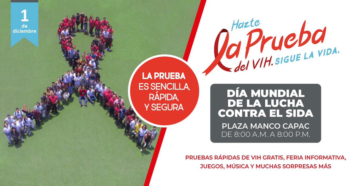 Con motivo del Día mundial de la respuesta frente al VIH, el Minsa brindará consejería y pruebas rápidas gratuitas. La actividad se realizará este sábado 1 de diciembre en la Plaza Manco Cápac (La Victoria), desde las 08.00 a.m. a 08:00 p.m.