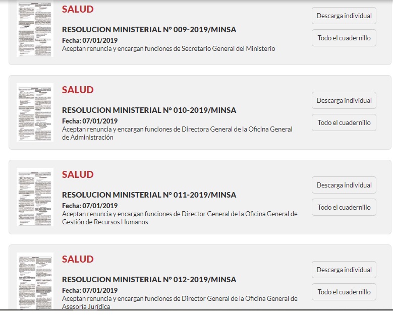 Todas las renuncias y designaciones, fueron publicadas en el diario oficial El Peruano y lleva la rubrica de la aún ministra de salud, Silvia Pessah, y les da las gracias a los profesionales por sus servicios prestados a la nación.