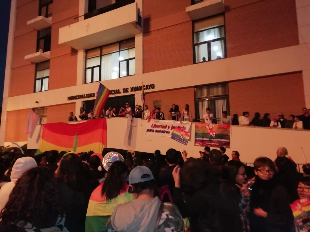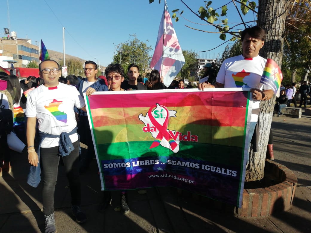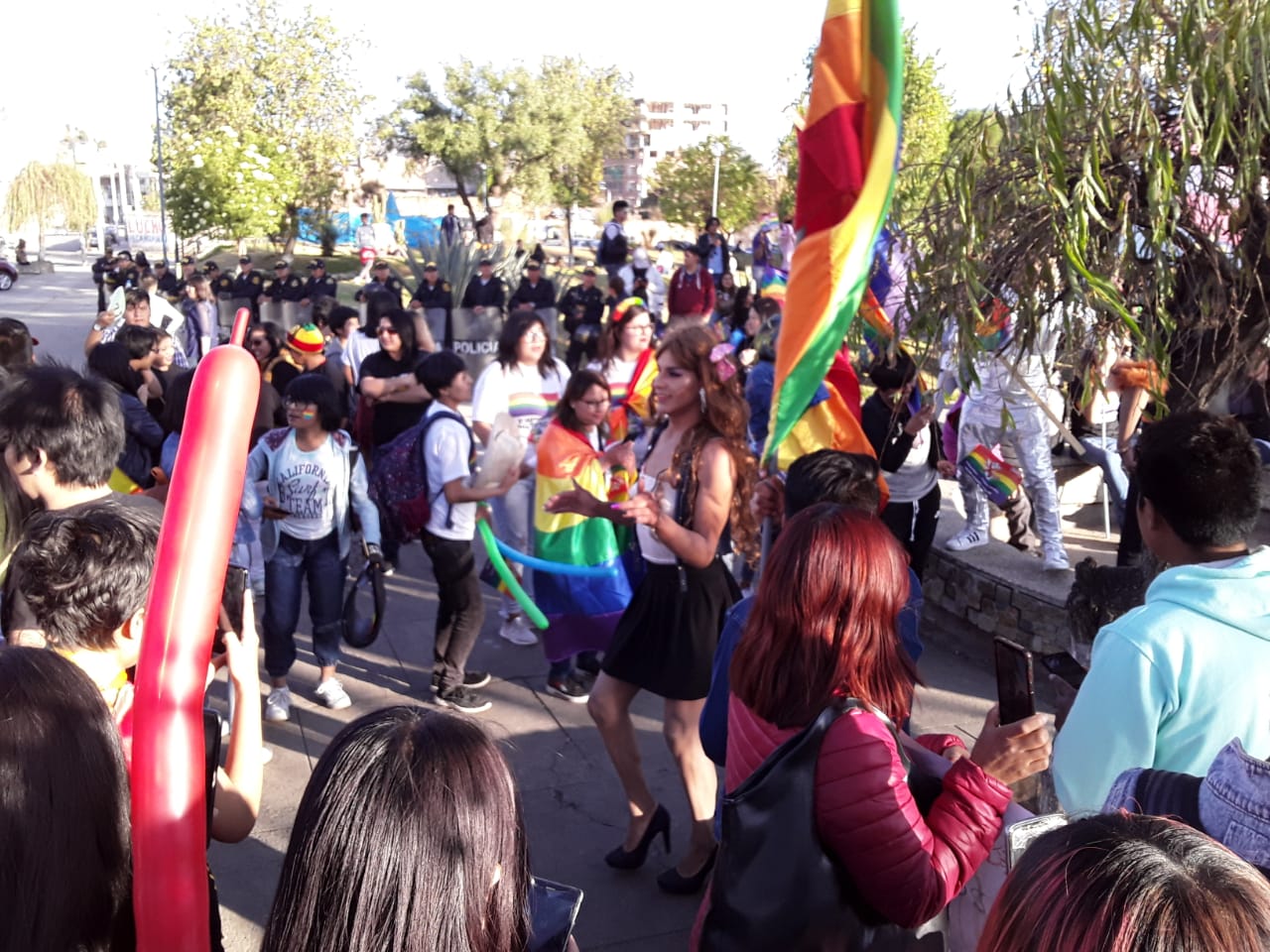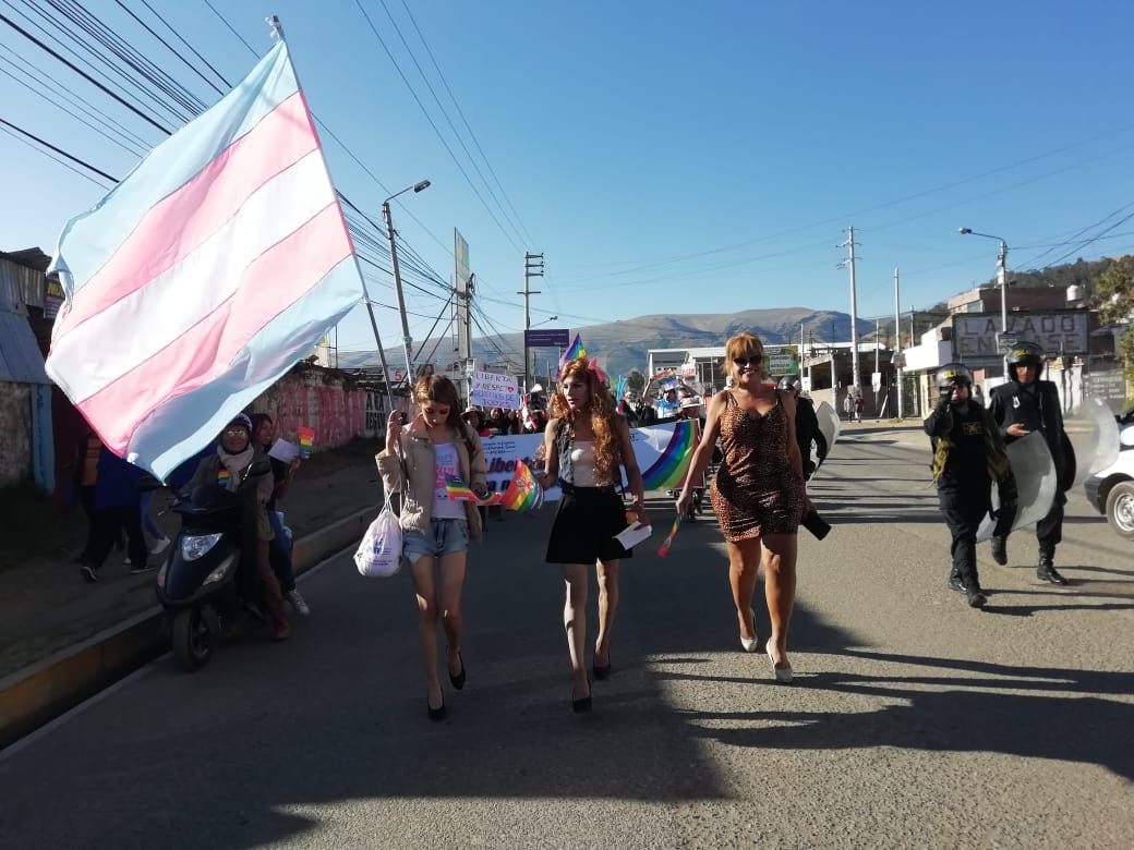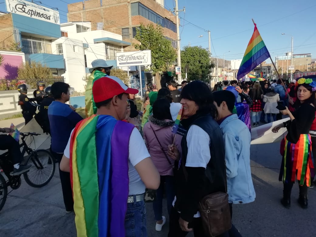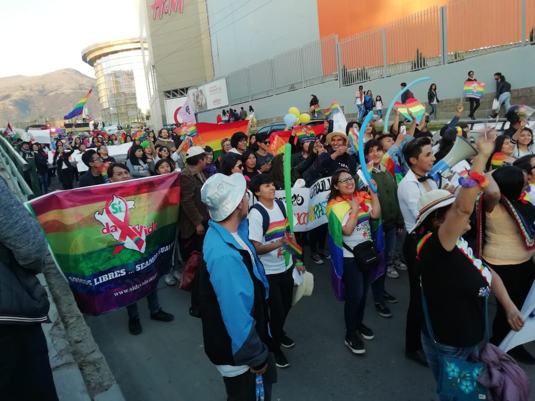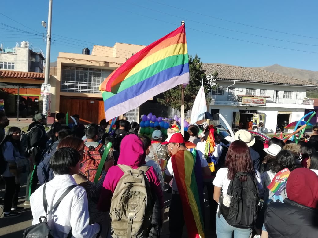 Huancayo, Perú.- Cientos de personas, con banderas multicolores marcharon, el sábado por el centro de la ciudad de Huancayo, para celebrar, por primera vez en su historia, la marcha del orgullo de personas Lesbianas, Gays, Trans, Bisexuales e Intersexuales (LGBTI) en la región. Los manifestantes, a viva voz, exigían igualdad de derechos, así como el fin de la discriminación para los integrantes de la comunidad LGTBI.