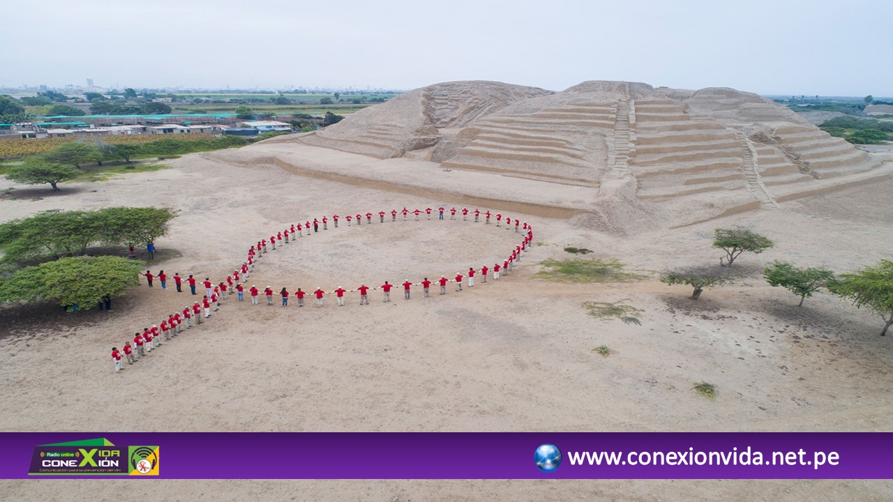 Trujillo, Perú.- Dentro del marco del Día Mundial de la respuesta contra el VIH, la Gerencia Regional de Salud La Libertad y la Dirección Desconcentrada de Cultura de La Libertad unieron esfuerzos y formaron un gigantesco lazo humano al pie de la “Huaca Toledo” del Complejo Arqueológico Chan Chan.