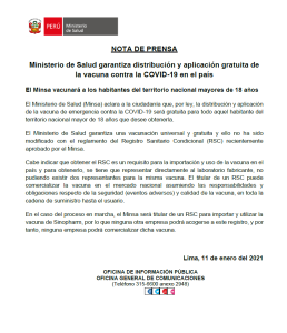 Agregó que el Estado debe garantizar acceso a la vacuna a todos los peruanos sin distinción alguna y que ello implique que el Ministerio de Salud actúe con transparencia, por ejemplo, en cuanto al precio de compra de las vacunas chinas de Sinopharm, ante lo cual la ministra Pilar Mazzetti se ha mostrado esquiva a responder, incluso, ante la prensa el último viernes.
