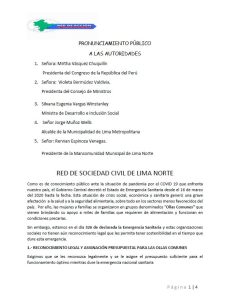 Lima, Perú.- Más de veinte organizaciones de la sociedad civil y religiosas, que conforman la Red de Sociedad Civil de Lima Norte, enviaron a la presidenta del Consejo de Ministros, Violeta Bermúdez, así como a los congresistas y alcaldes un pronunciamiento público, en el que exigen el reconocimiento legal y asignación presupuestal para las ollas comunes formadas durante la pandemia por Covid-19.