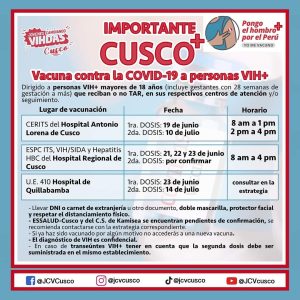 En la región Cusco se iniciará la siguiente semana. En el Hospital Regional la atención será este lunes 21, martes 22 y miércoles 23 de 8 de la mañana a 4 de tarde en la especialidad de ITS, VIH/SIDA y Hepatitis HBC Las fechas para la segunda dosis se informarán en los próximos días. En el Hospital de Quillabamba la primera dosis se inoculará el 23 de junio y la segunda, el 14 de julio.